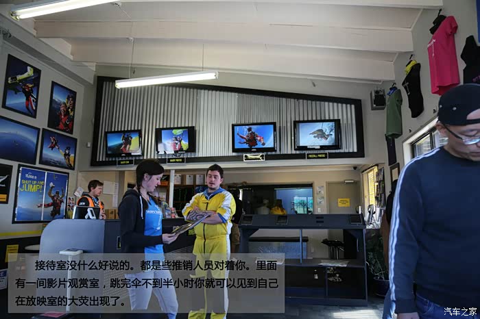 接待室没什么好说的。都是些推销人员对着你。里面有一间影片观赏室,跳完伞不到半小时你就可以见到自己在放映室的大荧出现了。