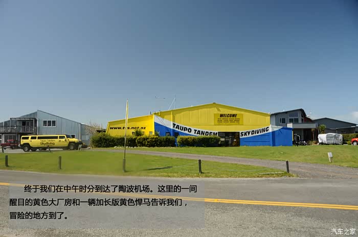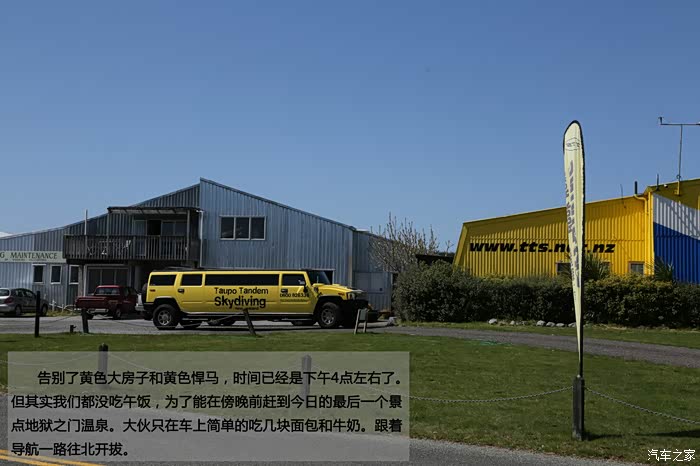 终于我们在中午时分到达了陶波机场。这里的一间醒目的黄色大厂房和一辆加长版黄色悍马告诉我们,冒险的地方到了。