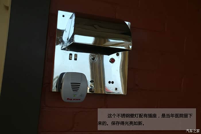 这个不锈钢壁灯配有插座,是当年医院留下来的。保存得光亮如新。