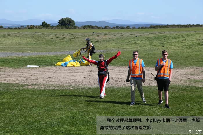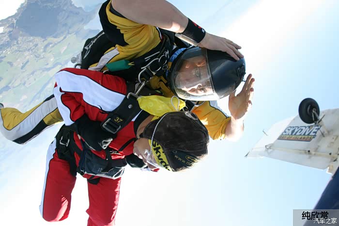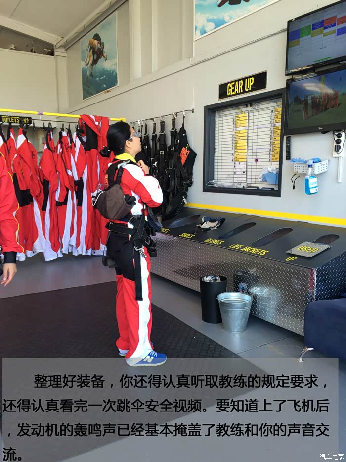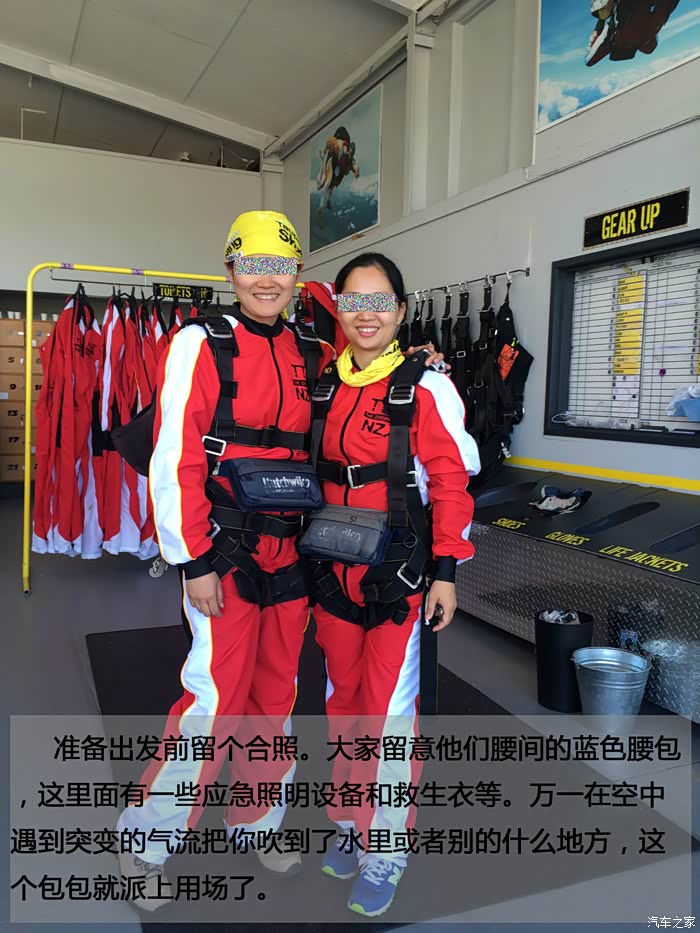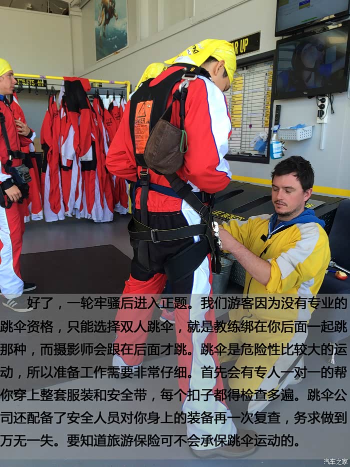 好了,一轮牢骚后进入正题。我们游客因为没有专业的跳伞资格,只能选择双人跳伞,就是教练绑在你后面一起跳那种,而摄影师会跟在后面才跳。跳伞是危险性比较大的运动,所以准备工作需要非常仔细。首先会有专人一对一的帮你穿上整套服装和安全带,每个扣子都得检查多遍。跳伞公司还配备了安全人员对你身上的装备再一次复查,务求做到万无一失。要知道旅游保险可不会承保跳伞运动的。