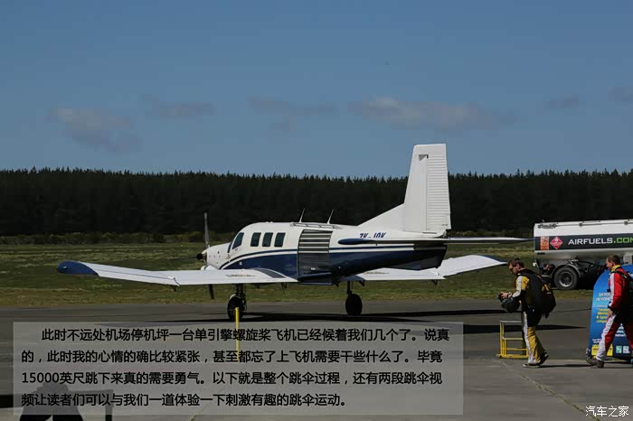 此时不远处机场停机坪一台单引擎螺旋桨飞机已经候着我们几个了。说真的,此时我的心情的确比较紧张,甚至都忘了上飞机需要干些什么了。毕竟15000英尺跳下来真的需要勇气。以下就是整个跳伞过程,还有两段跳伞视频让读者们可以与我们一道体验一下刺激有趣的跳伞运动。