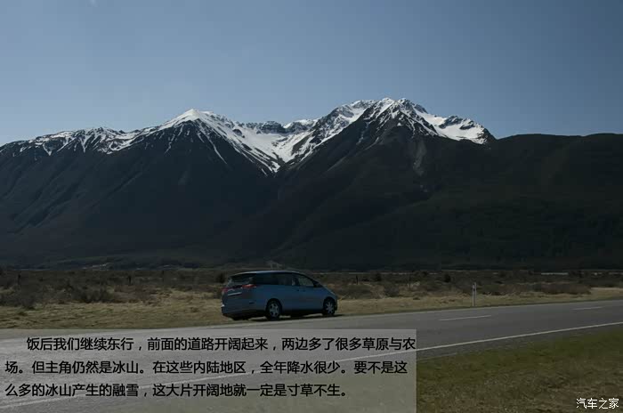 饭后我们继续东行,前面的道路开阔起来,两边多了很多草原与农场。但主角仍然是冰山。在这些内陆地区,全年降水很少。要不是这么多的冰山产生的融雪,这大片开阔地就一定是寸草不生。