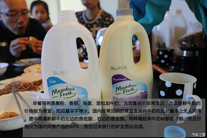 早餐照例是意粉、香肠、鸡蛋、面包加牛奶。当地畜牧业非常发达,因此新鲜牛奶的价格极为便宜,而且基本不掺水。国内经常见到的常温盒装纯牛奶在此处基本上无人问津。图中两灌新鲜牛奶左边的是低脂,右边的是全脂。两种喝起来牛奶味都很浓郁。而且价格仅为国内同类产品的60%,各位过来旅行的驴友吾忘品尝。