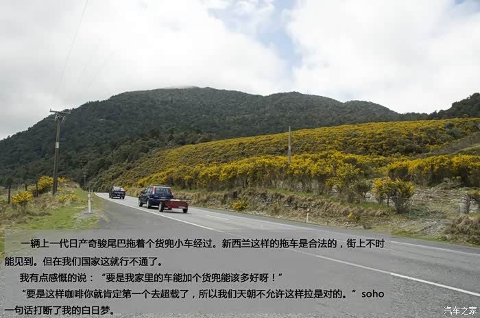 一辆上一代日产奇骏尾巴拖着个货兜小车经过。新西兰这样的拖车是合法的,街上不时能见到。但在我们国家这就行不通了。