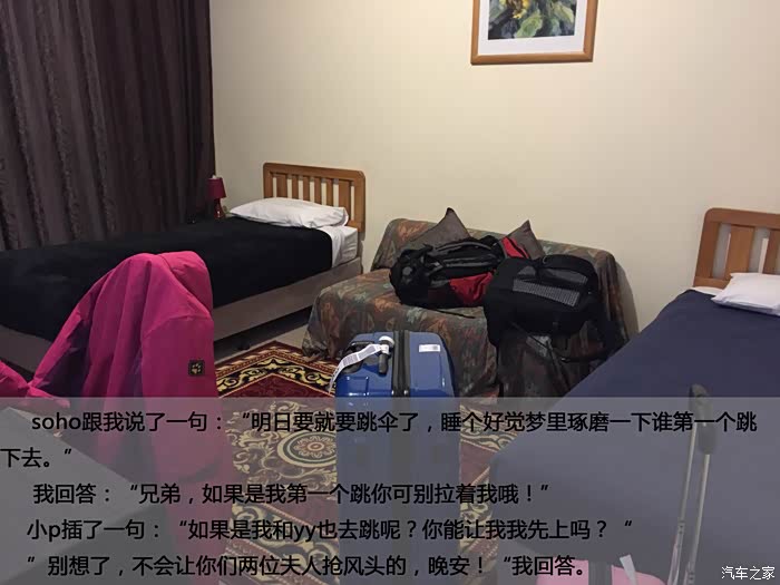 soho跟我说了一句:“明日要就要跳伞了,睡个好觉梦里琢磨一下谁第一个跳下去。”