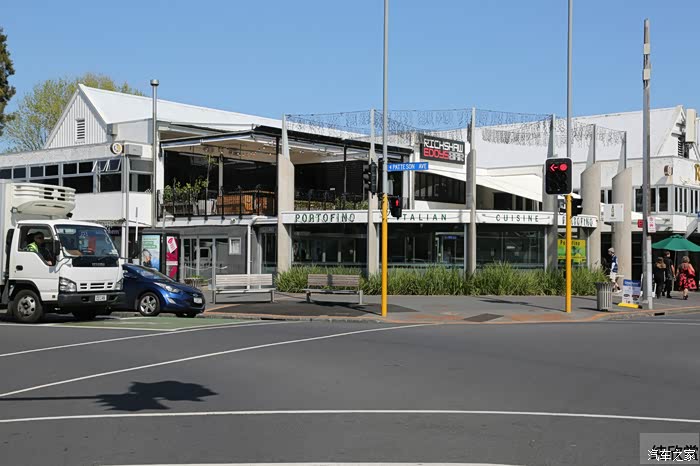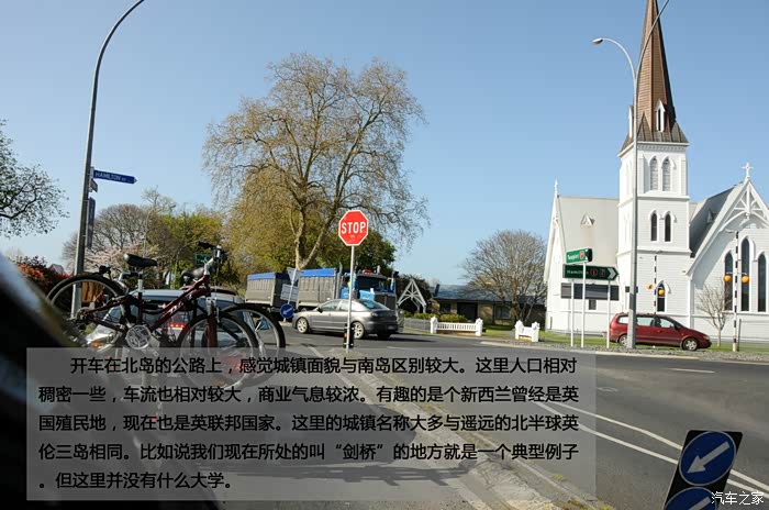 开车在北岛的公路上,感觉城镇面貌与南岛区别较大。这里人口相对稠密一些,车流也相对较大,商业气息较浓。有趣的是个新西兰曾经是英国殖民地,现在也是英联邦国家。这里的城镇名称大多与遥远的北半球英伦三岛相同。比如说我们现在所处的叫“剑桥”的地方就是一个典型例子。但这里并没有什么大学。