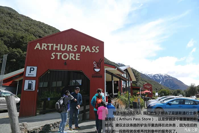 到了午后2点左右,我们的车子抵达了亚瑟斯通行士多服务区(Arthurs Pass Store),这是穿越途中最重要的补给点。建议走这条路的驴友尽量选择在此休息,因为往后的很远的一段路程就很难再找到像样的服务区了。