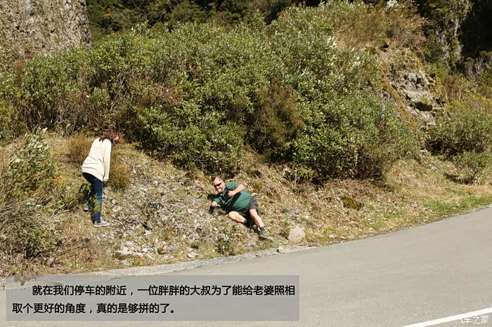 就在我们停车的附近,一位胖胖的大叔为了能给老婆照相取个更好的角度,真的是够拼的了。