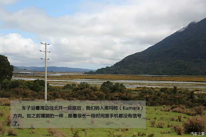 车子沿着海边往北开一段路后,我们转入库玛拉(Kumara)方向。如之前猜测的一样,跟着很长一段时间里手机都没有信号了。