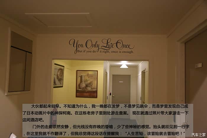 门外的走廊依然安静,但光线没有昨晚的昏暗,少了些神秘的感觉。抬头就能见到一行字,在这里我就不作翻译了,但我总觉得这段话在提醒我:“人生苦短,该冒险就去冒险吧!”