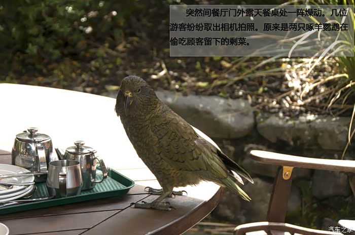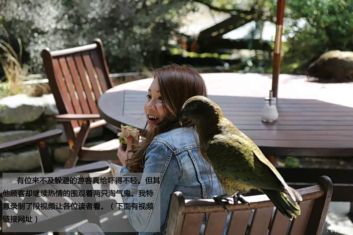 突然间餐厅门外露天餐桌处一阵燥动。几位游客纷纷取出相机拍照。原来是两只啄羊鹦鹉在偷吃顾客留下的剩菜。