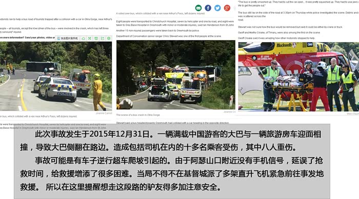 此次事故发生于2015年12月31日。一辆满载中国游客的大巴与一辆旅游房车迎面相撞,导致大巴侧翻在路边。造成包括司机在内的十多名乘客受伤,其中八人重伤。