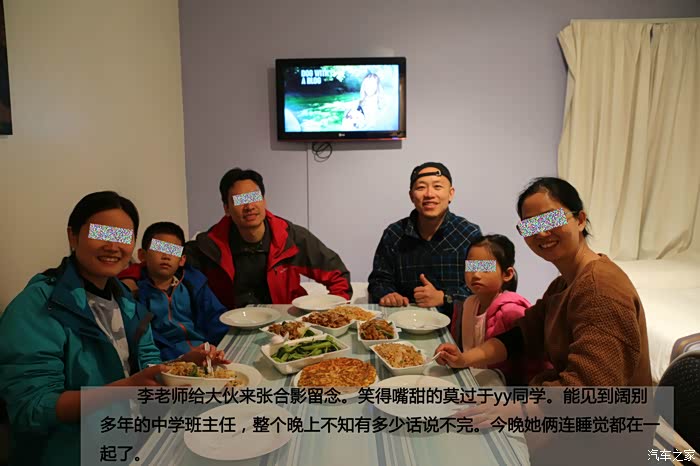 李老师给大伙来张合影留念。笑得嘴甜的莫过于yy同学。能见到阔别多年的中学班主任,整个晚上不知有多少话说不完。今晚她俩连睡觉都在一起了。