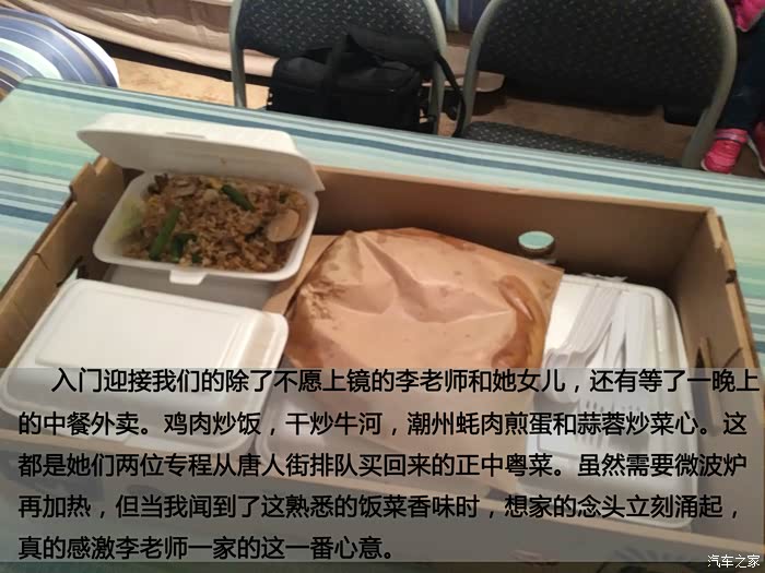 入门迎接我们的除了不愿上镜的李老师和她女儿,还有等了一晚上的中餐外卖。鸡肉炒饭,干炒牛河,潮州蚝肉煎蛋和蒜蓉炒菜心。这都是她们两位专程从唐人街排队买回来的正中粤菜。虽然需要微波炉再加热,但当我闻到了这熟悉的饭菜香味时,想家的念头立刻涌起,真的感激李老师一家的这一番心意。