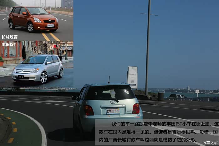 我们的车一路跟着李老师的丰田IST小车在街上跑。这款车在国内是难得一见的。但读者是否觉得眼熟。没错,国内的厂商长城有款车叫炫丽就是模仿了它的外形。