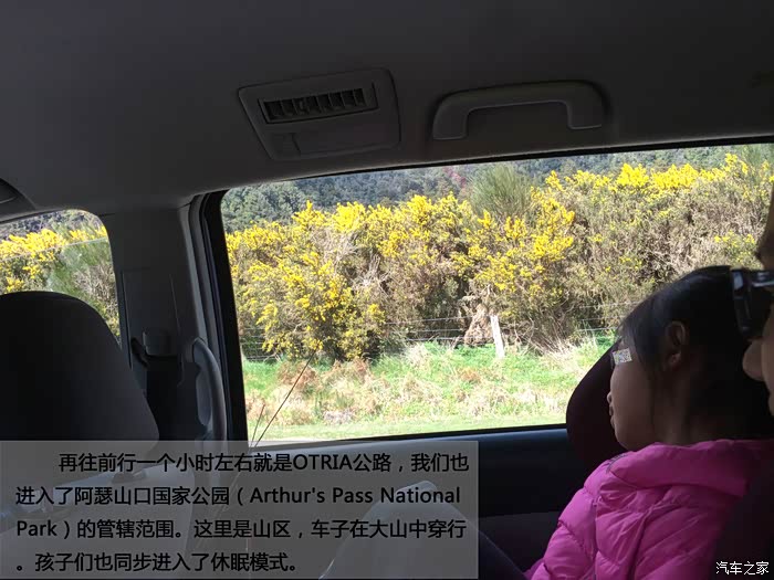 再往前行一个小时左右就是OTRIA公路,我们也进入了阿瑟山口国家公园(Arthur's Pass National Park)的管辖范围。这里是山区,车子在大山中穿行。孩子们也同步进入了休眠模式。