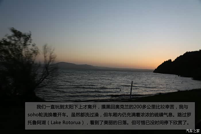 我们一直玩到太阳下上才离开,摸黑回奥克兰的200多公里比较幸苦,我与soho轮流换着开车。虽然都洗过澡,但车厢内仍充满着浓浓的硫磺气息。路过罗托鲁阿湖(Lake Rotorua),看到了美丽的日落。但可惜已没时间停下欣赏了。