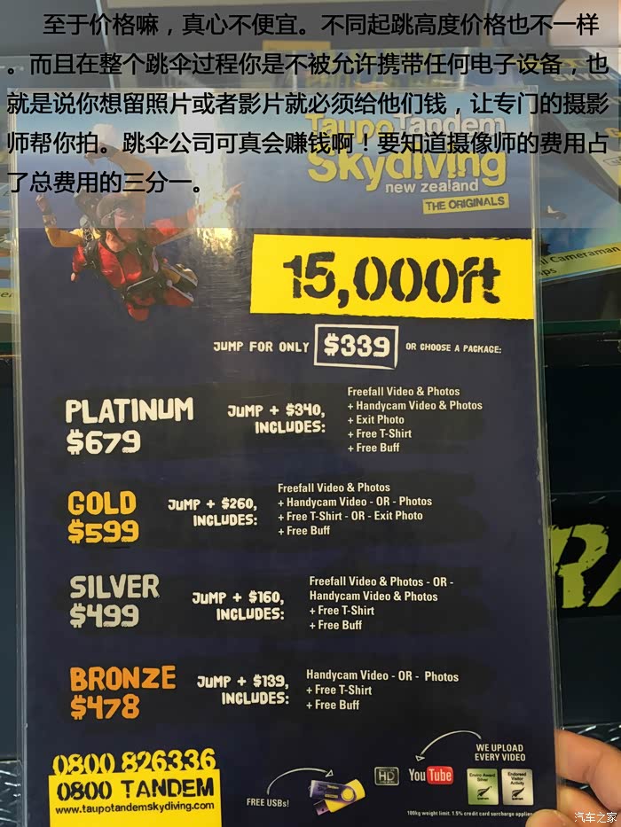 至于价格嘛,真心不便宜。不同起跳高度价格也不一样。而且在整个跳伞过程你是不被允许携带任何电子设备,也就是说你想留照片或者影片就必须给他们钱,让专门的摄影师帮你拍。跳伞公司可真会赚钱啊!要知道摄像师的费用占了总费用的三分一。