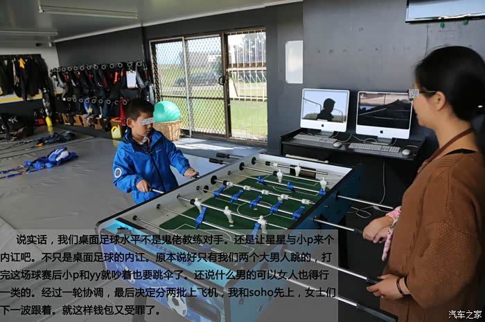 说实话,我们桌面足球水平不是鬼佬教练对手。还是让星星与小p来个内讧吧。不只是桌面足球的内讧。原本说好只有我们两个大男人跳的,打完这场球赛后小p和yy就吵着也要跳伞了。还说什么男的可以女人也得行一类的。经过一轮协调,最后决定分两批上飞机,我和soho先上,女士们下一波跟着。就这样钱包又受罪了。