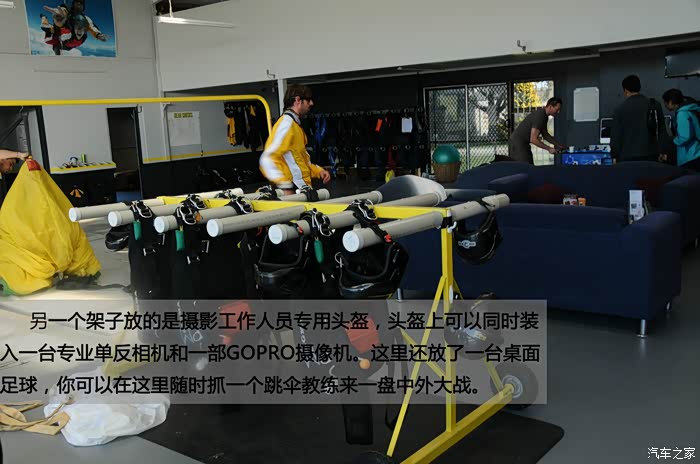 另一个架子放的是摄影工作人员专用头盔,头盔上可以同时装入一台专业单反相机和一部GOPRO摄像机。这里还放了一台桌面足球,你可以在这里随时抓一个跳伞教练来一盘中外大战。