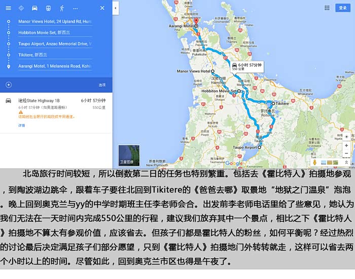 北岛旅行时间较短,所以倒数第二日的任务也特别繁重。包括去《霍比特人》拍摄地参观,到陶波湖边跳伞,跟着车子要往北回到Tikitere的《爸爸去哪》取景地“地狱之门温泉”泡泡。晚上回到奥克兰与yy的中学时期班主任李老师会合。出发前李老师电话里给了些意见,她认为我们无法在一天时间内完成550公里的行程,建议我们放弃其中一个景点,相比之下《霍比特人》拍摄地不算太有参观价值,应该省去。但孩子们都是霍比特人的粉丝,如何平衡呢?经过热烈的讨论最后决定满足孩子们部分愿望,只到《霍比特人》拍摄地门外转转就走,这样可以省去两个小时以上的时间。尽管如此,回到奥克兰市区也得是午夜了。