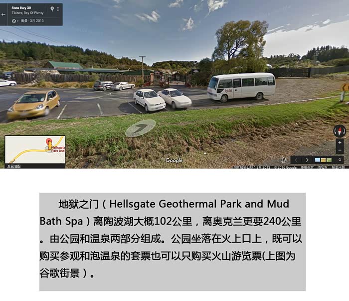 地狱之门(Hellsgate Geothermal Park and Mud Bath Spa)离陶波湖大概102公里,离奥克兰更要240公里。由公园和温泉两部分组成。公园坐落在火上口上,既可以购买参观和泡温泉的套票也可以只购买火山游览票(上图为谷歌街景)。