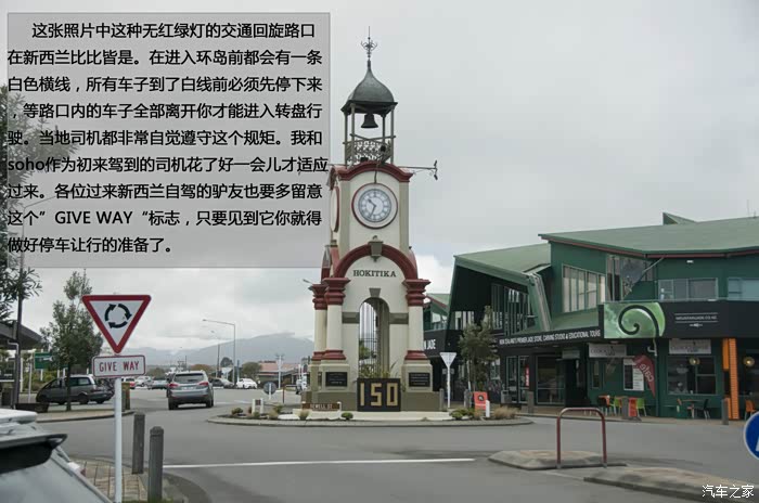 这张照片中这种无红绿灯的交通回旋路口在新西兰比比皆是。在进入环岛前都会有一条白色横线,所有车子到了白线前必须先停下来,等路口内的车子全部离开你才能进入转盘行驶。当地司机都非常自觉遵守这个规矩。我和soho作为初来驾到的司机花了好一会儿才适应过来。各位过来新西兰自驾的驴友也要多留意这个”GIVE WAY“标志,只要见到它你就得做好停车让行的准备了。