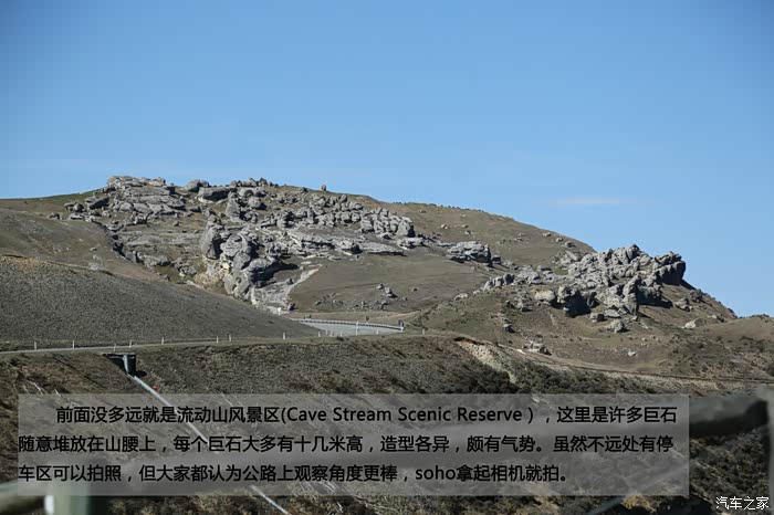 前面没多远就是流动山风景区(Cave Stream Scenic Reserve),这里是许多巨石随意堆放在山腰上,每个巨石大多有十几米高,造型各异,颇有气势。虽然不远处有停车区可以拍照,但大家都认为公路上观察角度更棒,soho拿起相机就拍。