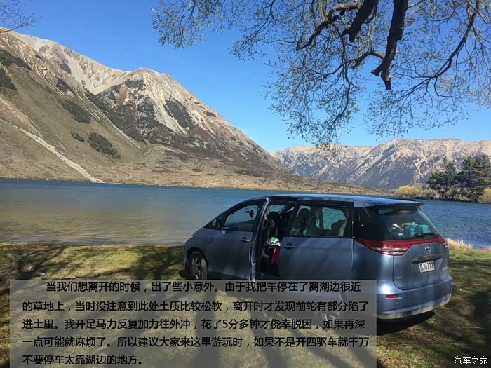 当我们想离开的时候,出了些小意外。由于我把车停在了离湖边很近的草地上,当时没注意到此处土质比较松软,离开时才发现前轮有部分陷了进土里。我开足马力反复加力往外冲,花了5分多钟才侥幸脱困,如果再深一点可能就麻烦了。所以建议大家来这里游玩时,如果不是开四驱车就千万不要停车太靠湖边的地方。