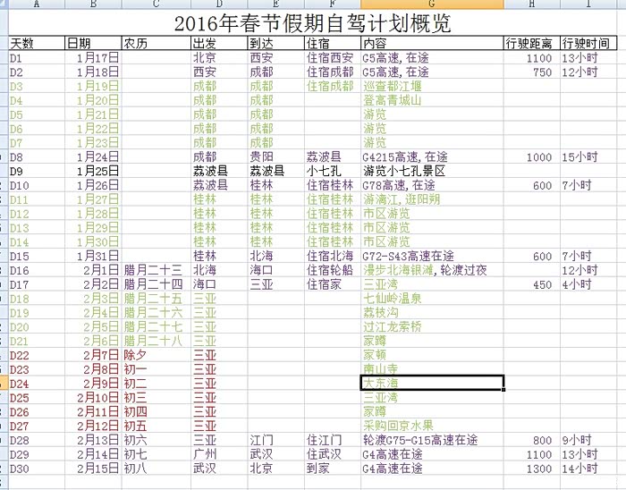 2016年1月初带着充足的时间开始了计划已久的远行自驾.记得第一次驾车到三亚是2002年底,一家四人开着平生第一辆汽车(夏利)从首都开往祖国的最南端,一路艰辛而愉快的旅途让我记忆犹新,十年后30多岁的我也组建了自己的家庭,一直希望有时间带老婆一起重走老路,体验一下越过北回归线的感觉.话不多说,下面介绍旅途.计划赶不上变化,公里数和时间基本差不多,具体路线已实际发生为准.这次旅行计划30天北京-西安-成都-贵阳-桂林-北海-三亚,全程9000公里左右.1月15号晚上为了避开第二天北京的早高峰所以晚上10点出发,能开多久是多久困了就睡觉.3小时后到了石家庄服务区.困的不行,睡觉!外面温度不算高,但...