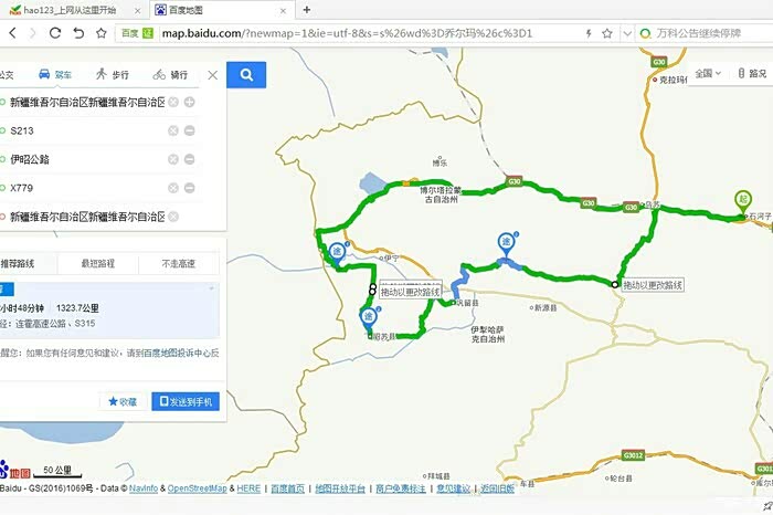 是从尼勒克县走S315向东30公里,到吉林台水电站牌子那里左拐走X779,那一段是上坡的水泥路面,那一段50公里的景色非常漂亮,即将结束山路时路左手有卖山花蜜的,可以买一些,最后会在乌拉斯台乡和S315汇合,接下来就是著名的百里画廊了,那段路就是下图的“途3”那一段,你也可以仔细看我第三天的路线图