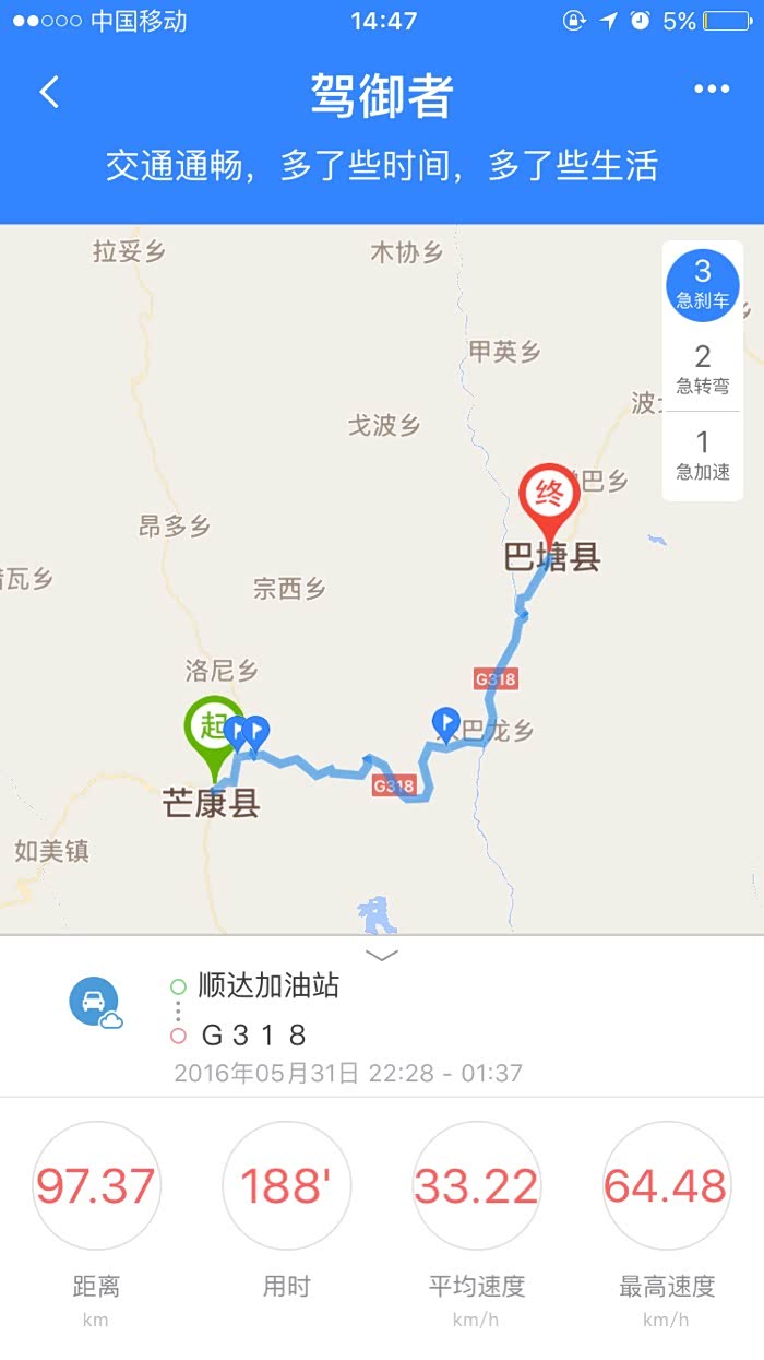 期待芒康-巴塘的白天风景,我是5.31号夜里走那段路错过了好风景,只记得有几段路特别烂,晚上没看清什么情况