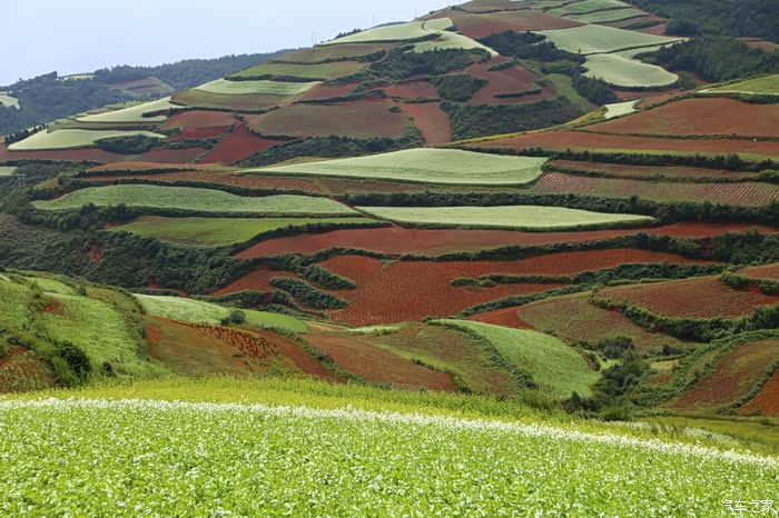 东川红土地位于昆明市东川区西南40多公里的新田乡、一个叫“花石头”(在109公里里程碑处)的地方,这里方圆近百里的区域是云南红土高原上最集中、最典型、最具特色的红土地,被专家认为是全世界除巴西里约热内卢外最有气势的红土地,而其景象甚至比巴西红土地更为壮美。第一眼看到那极具层次的彩色线条,你会觉得它美得太不真实了。 放眼望去,山川和原野呈现出一片片暗红、紫红、砖红等不同的红色,方圆数百里大大小小的山头、山坡上,油菜花与洋芋花热烈地绽放着,金色的麦浪在清凉的山风下如碧浪般翻滚,一层绿,一层白,又一层红,一层金。鲜艳浓烈的色块一直铺向天边,看似漫不经心,却又形成如仙境般五彩缤纷的图案。远远望去,仿佛上天涂抹的色块,色彩斑斓炫目、艳丽饱满,有着优美的线条,又勾画得如此浓墨重彩。