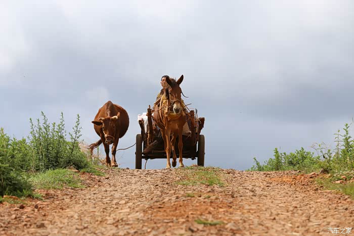 黄牛没有拉车哦,它刚犁地归来与马车同路一同回家。