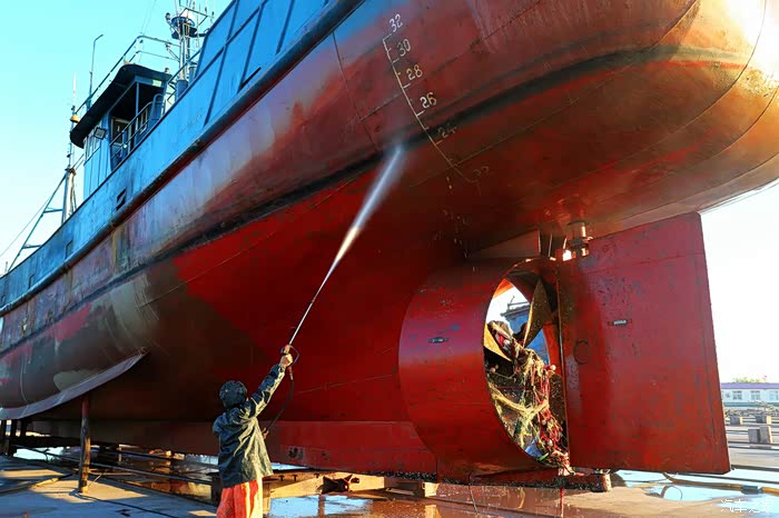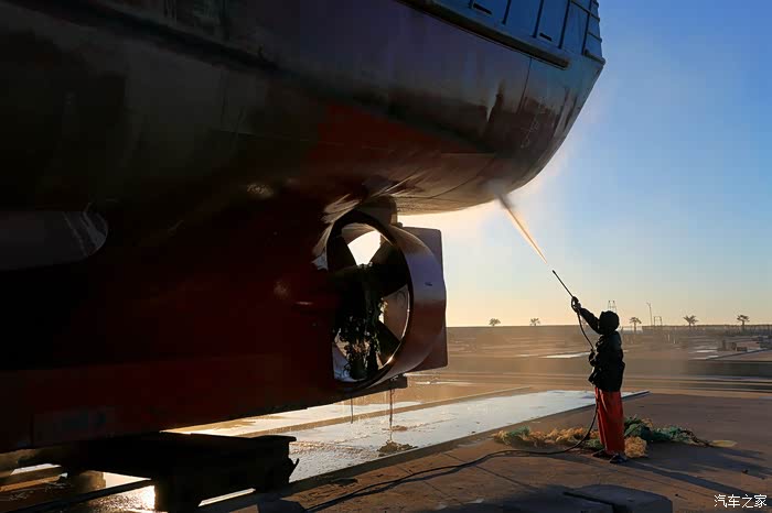 工人正在清洗船底的污物,看在海里飘荡的一叶小舟,上岸后就成了庞然大物!如果是万吨轮上岸不知道会有多震撼!请原谅我这个没见过世面的旱鸭子哈~~哈哈~~