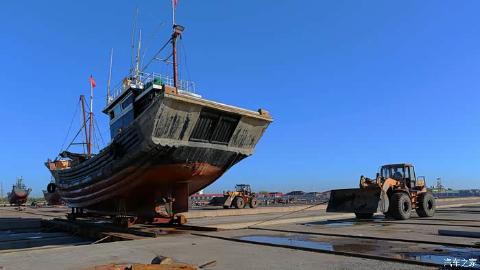 这是准备横向拖离下水轨道,拖至维修工位轨道!需要2台铲车同时发力,将船平移