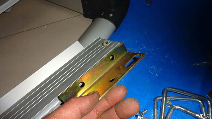 开始安装行李架于车顶横杆连接板,前面提到过,边框卡槽里面提前 塞进去的方形螺母,用于固定连接板!