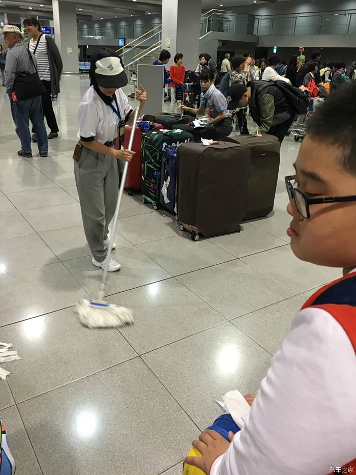 到达大阪时正好下小雨,保洁人员看见地板上有水渍就赶紧拖掉。