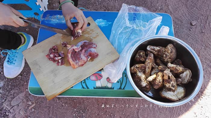 在芒康县的拉乌山切鲜牦牛肉、清洗松茸