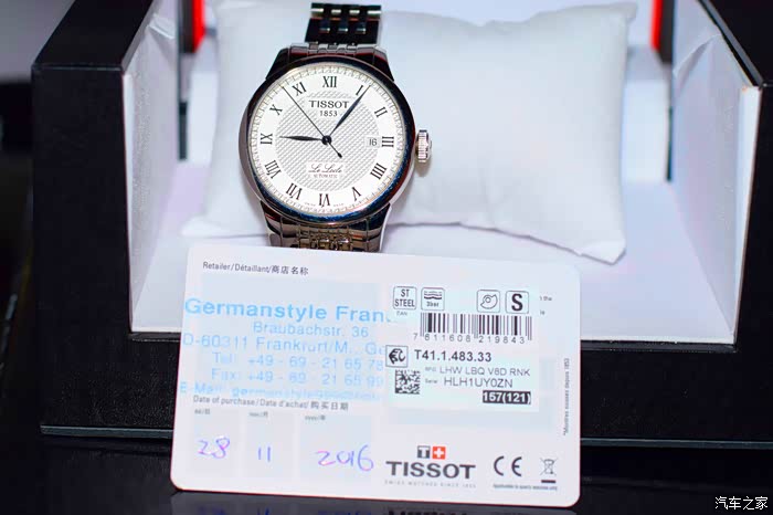 2016年11月底,同事出差去德国,趁此机会,撒摸了好久的手表终于可以出手了。三线都排不上的县城,戴一个入门的机械表就足矣,就算戴上卡地亚,手挎LV,在我们这也当做是水货、高仿,无人欣赏。毕业上班后当时一月工资只有1000块(2011年),上交给家里200,攒了段时间,买了一款天王的石英手表,京东货,不到400RMB,到买这个才摘下来,放家里,依然跑字儿!但是随着出差多,见客户多,再戴着那个不大像个样子,就想买一款稍微好点的机械表。太贵了买不起,也没必要,还要生活的,Tissot 力洛克系列的这款T41.1.483.33还是不错的,简洁大方,一目了然。买之前,就从TMAILL和JD参考价格,大概在2800-3200RMB之间,考虑到有假货,就放弃此渠道。当地商场4450RMB,打九折,也得4000RMB+。朋友从迪拜mall带回来的是2800RMB+,但是当时没和人家说,她人在沙特。Tissot 瑞士产,但是欧洲价格也差不多吧,只能等同事去德国的时候,顺便带回来,最后退完税的价格大约在400€,合算人民币差不多3060RMB。(以下部分文字摘自百科)