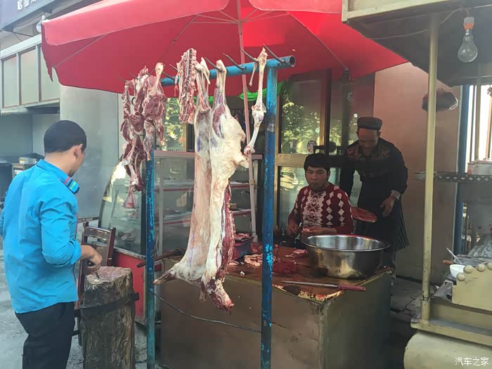 吃完凉皮,我们都觉得有些饱了,于是就沿着马路慢慢往回逛看看各种西域风情,很新奇逛了半小时,看到一家馆子,门口吊着羊茶爸说,我们就这样不吃晚饭了吗?晚饭不吃不太好吧于是我们又进去了。进去以后才发现懵逼了。。墙上桌上的菜单都是维文的。还好,维吾尔族大胡子老板过来了。大叔会一些不太熟练的汉语,但口音极重。问我们从哪里来,我们说西藏过来的大叔说,曾经他也在拉萨打过工,所以会一些汉语跟大叔连比带划的讲半天,茶爸是一句也没听懂问他要吃什么,羊肉串。于是大叔冲伙计嚷了几句,伙计就冲出去割羊肉串羊肉串了原来这里的羊肉串都是现割现串现烤的我看着墙上看不懂的菜单,问大叔,馕炒肉有吗?有。于是我们的晚饭就是一盘馕炒...