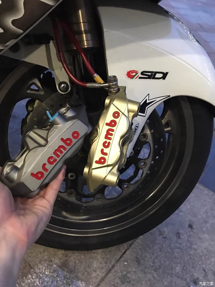 前后刹车线改成了钢吼,原厂OEM的M4.32金色鲍鱼最后还是换成M40了,感觉还是比OEM的好一些,我也知道换 GP4-RX更骚,可是没钱怎么办呢