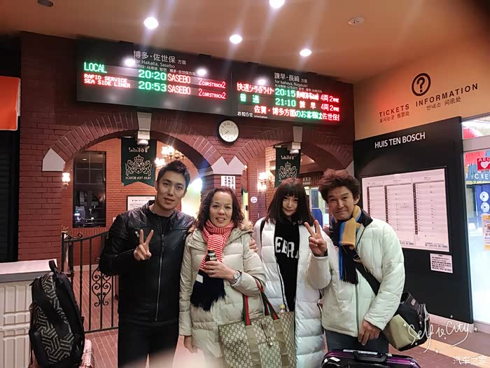 母亲在日本居住了多年这是第一次去她生活的城市探访,最右边的是杉永敏聪我们都称他米酱。 一家人来到位于长崎县的豪斯登堡车站已经是晚上八点,找来位路人帮我们拍照在车站留个合影。