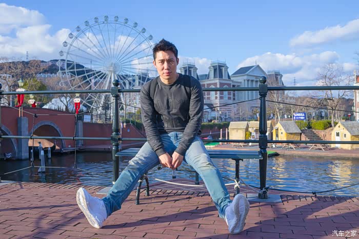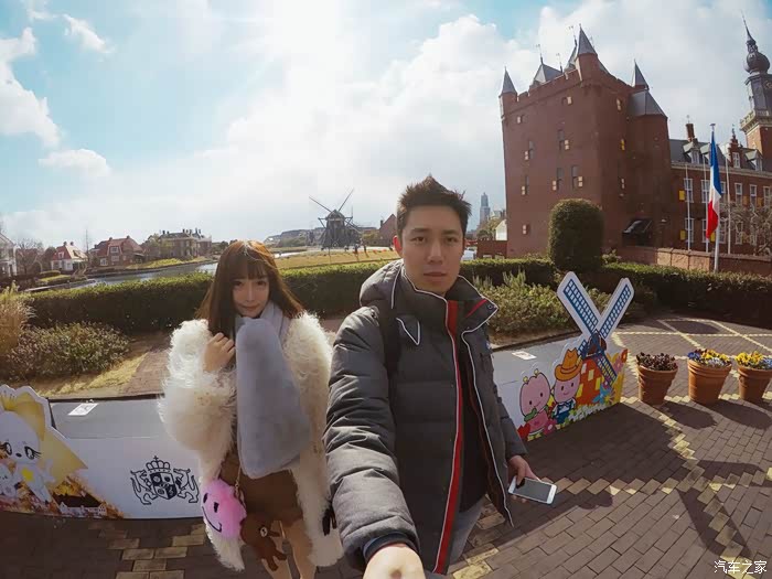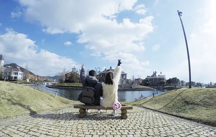 在画有呆萌卡通形象的入口公告板前面合影,背景中映衬着巨大的风车和古堡。豪斯登堡的面积比东京迪斯尼乐园还要大两倍是亚洲最大的休闲度假主题公园