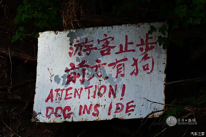 中英文提示牌:游客止步,前方有狗