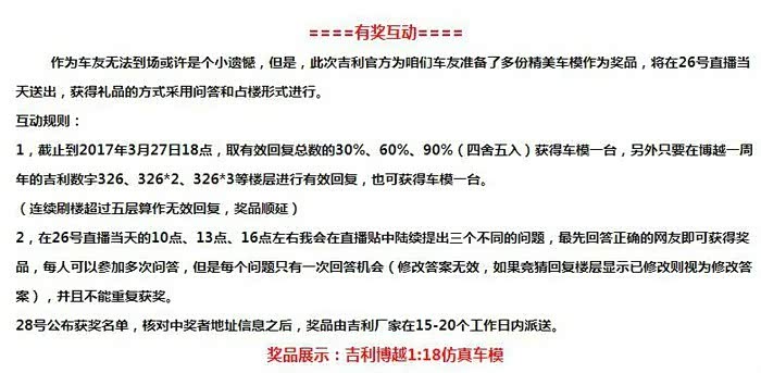 此直播会主要是博越一周年的庆典和发布3.0智能语音系统。活动现场十分精彩,当天我也跟随我们的超驾的镜头观看到了活动现场。拐弯兄弟你辛苦啦!活动就是在直播的时候互动就行,答题可以获奖。评论抽到幸运楼层也可以获奖。此次的奖品就是1:18的博越车模一辆,此次一共送出了17辆车模,我也是众多幸运者中的一员。当时那个心情无法言语呀!说多了多是故事,我就车模到手后再来跟大家分享下这份喜悦,同时对车模进行一个简单的了解: