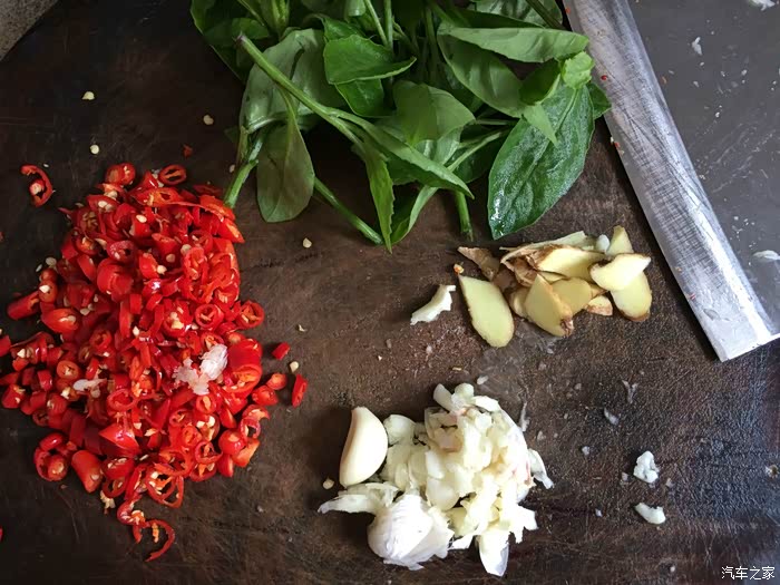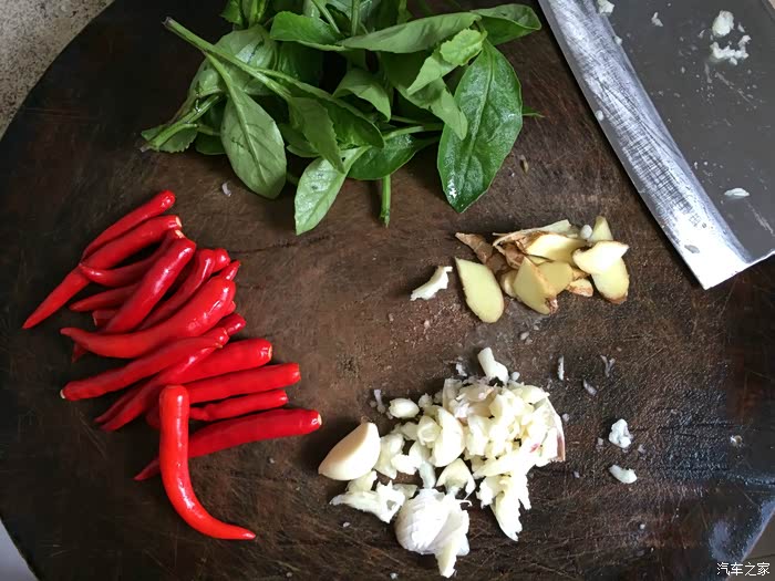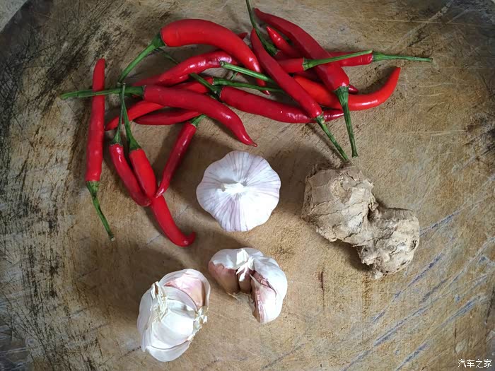 ↑ 准备作料大蒜子、生姜和红尖椒