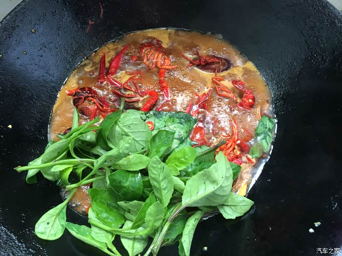 回到家里清洗,配料生姜、大蒜子和红辣椒。采摘阳台上种植的草珊瑚叶芽数棵,掌勺折腾出一只创新菜品:草珊瑚辣子小龙虾。这道菜,想必前无古人,也许后有来者。