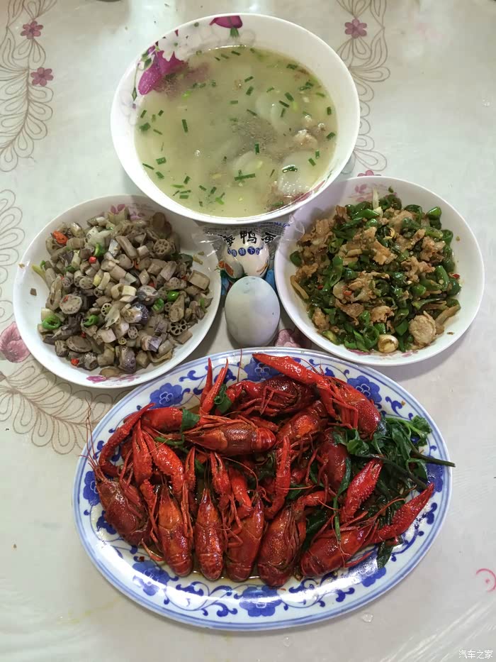 ↑ 两个人的午餐。不怕大家笑话,中午,我比平时竟然多吃了一大碗饭(图为草珊瑚辣子小龙虾、肉片青椒、肉丁炒藕节尖、排骨山药汤、咸鸭蛋、皮蛋)发帖完毕,谢谢观赏