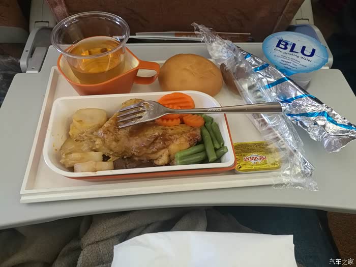 飞机上的餐食,一大块肌肉,味道一般,比国内我吃过的味道要好一点。